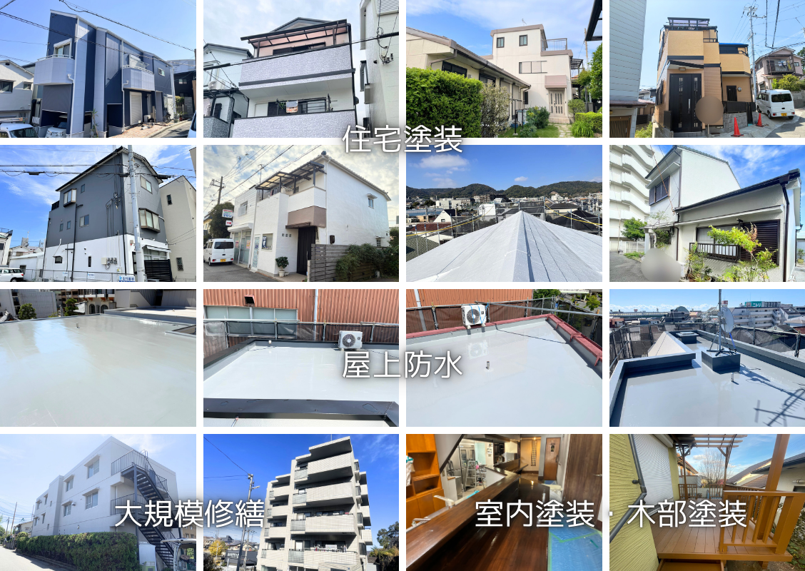 以下の住宅の外壁塗装・屋根塗装、屋上防水工事、大規模修繕、マンション改修、室内塗装、木部塗装、すべて当店の施工実績です。