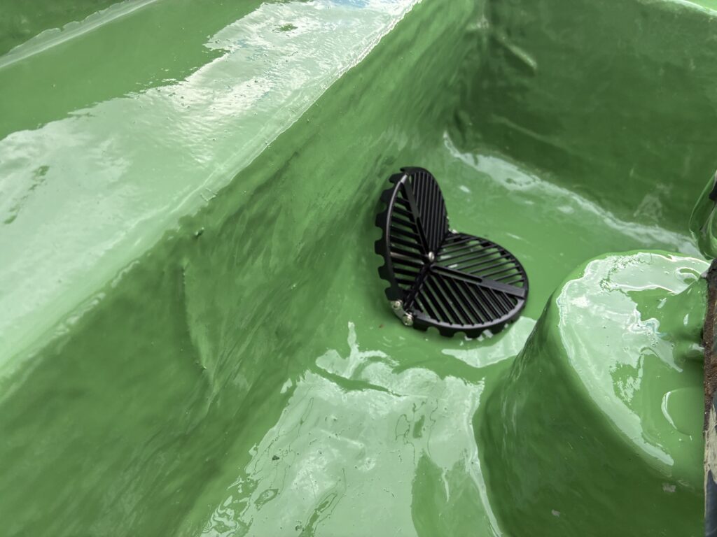 排水ドレン内に落ち葉やごみ等が詰まらないように専用ストレーナー(蓋)を設置しお引渡しです。