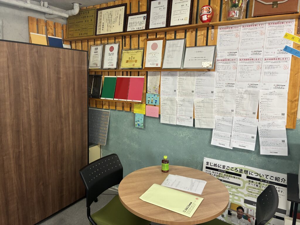 まごころ塗想の事務所は、小さいので限られたスペースとなりますがお客様との良いお時間になるようにこのようなお席は、ございます。外壁塗装工事のお見積り~ご提案の際は、お家に伺うことが大半ですが、まごころ塗想へ来て頂く事ももちろん可能ですので「まごころ塗想がどんな会社なのか?」知りたい方はぜひお申し付けくださいね♪顧客様からのリアルなお客様の声や表彰実績や資格・営業許可証など掲載しております。