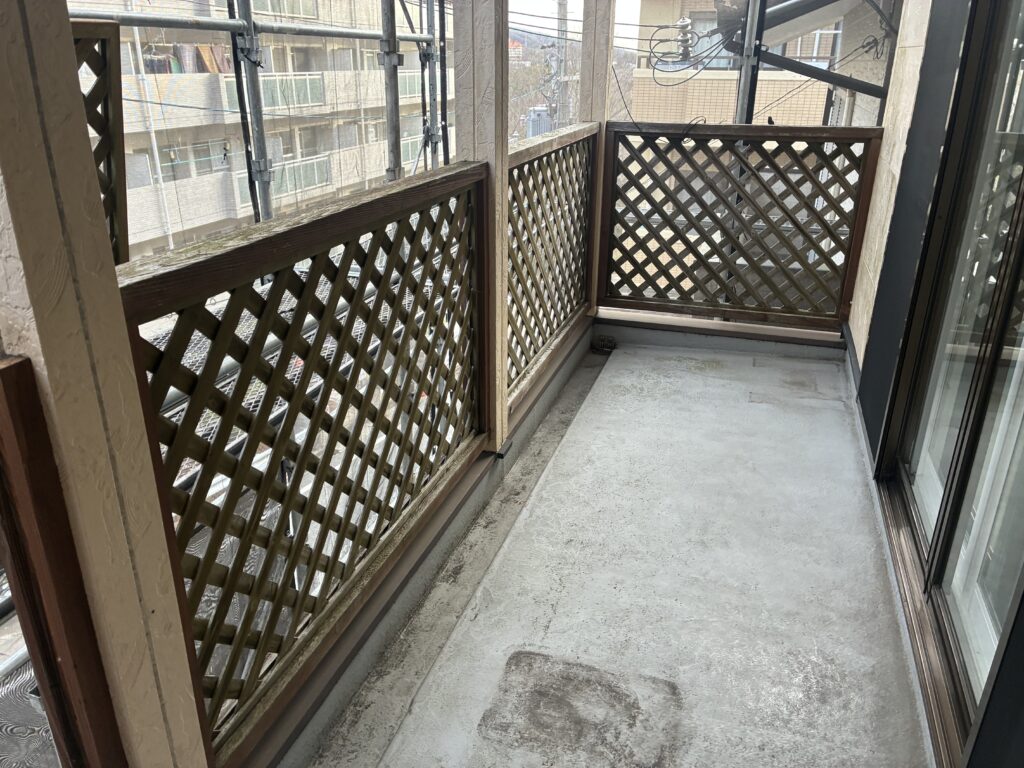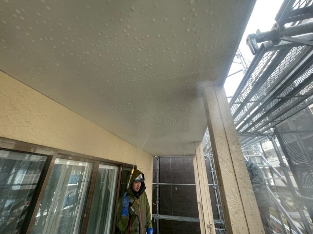 高圧洗浄は、長年蓄積された汚れを落とし「塗料の付着性」「美観性」をより、高めるための大切な工程となります。洗浄作業の方は、若手たちに任せて私は、木製手摺などの撤去を行いました。