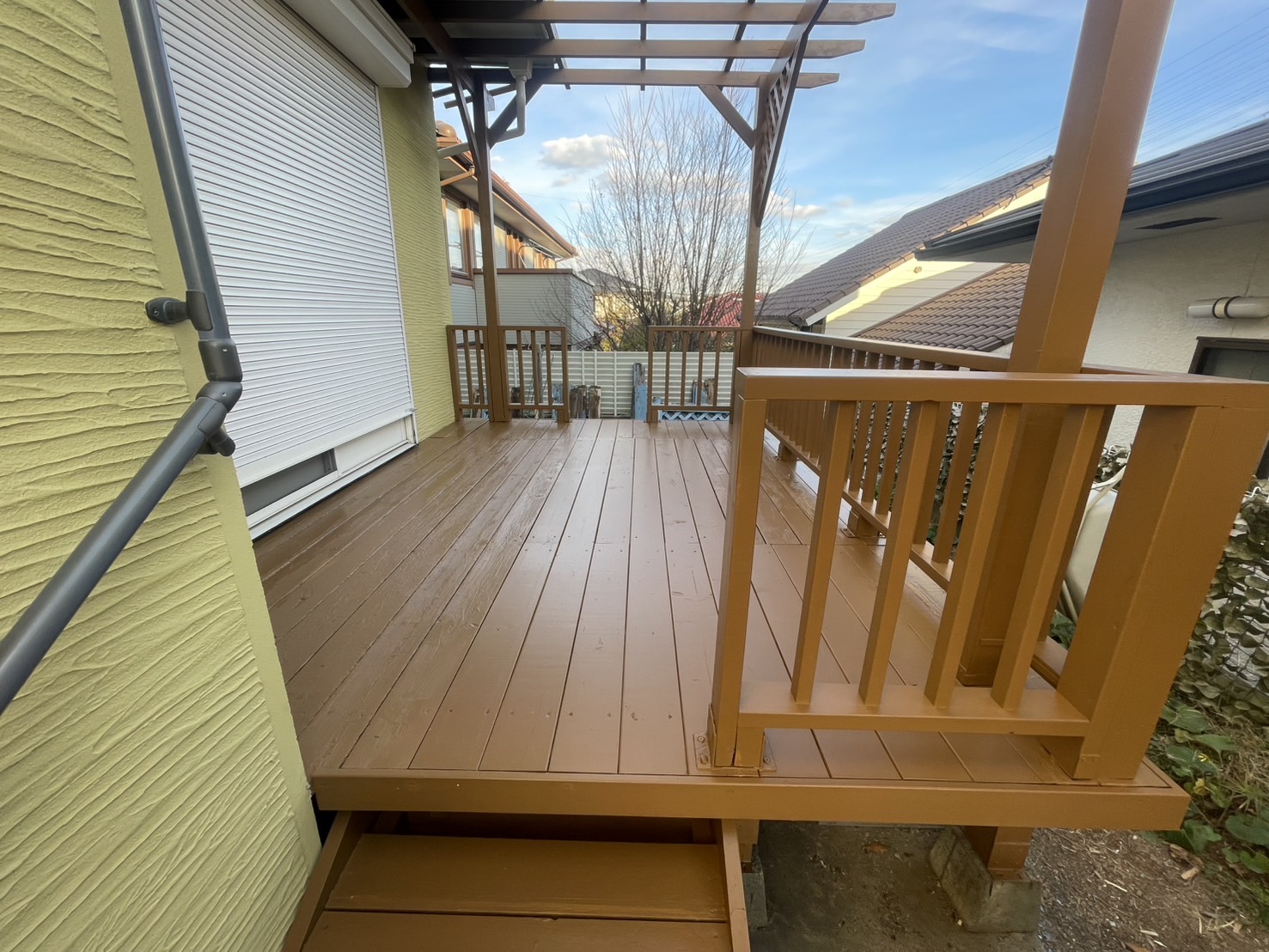 「F様この度は、お家の外壁塗装工事に続き大切なウッドデッキ塗装までご依頼いただき誠にありがとうございました。防腐剤にて塗装をさせていただきましたので木材が腐る心配は、ございませんが定期的に防腐剤塗装をよろしくお願いいたします。いつもありがとうございます。」