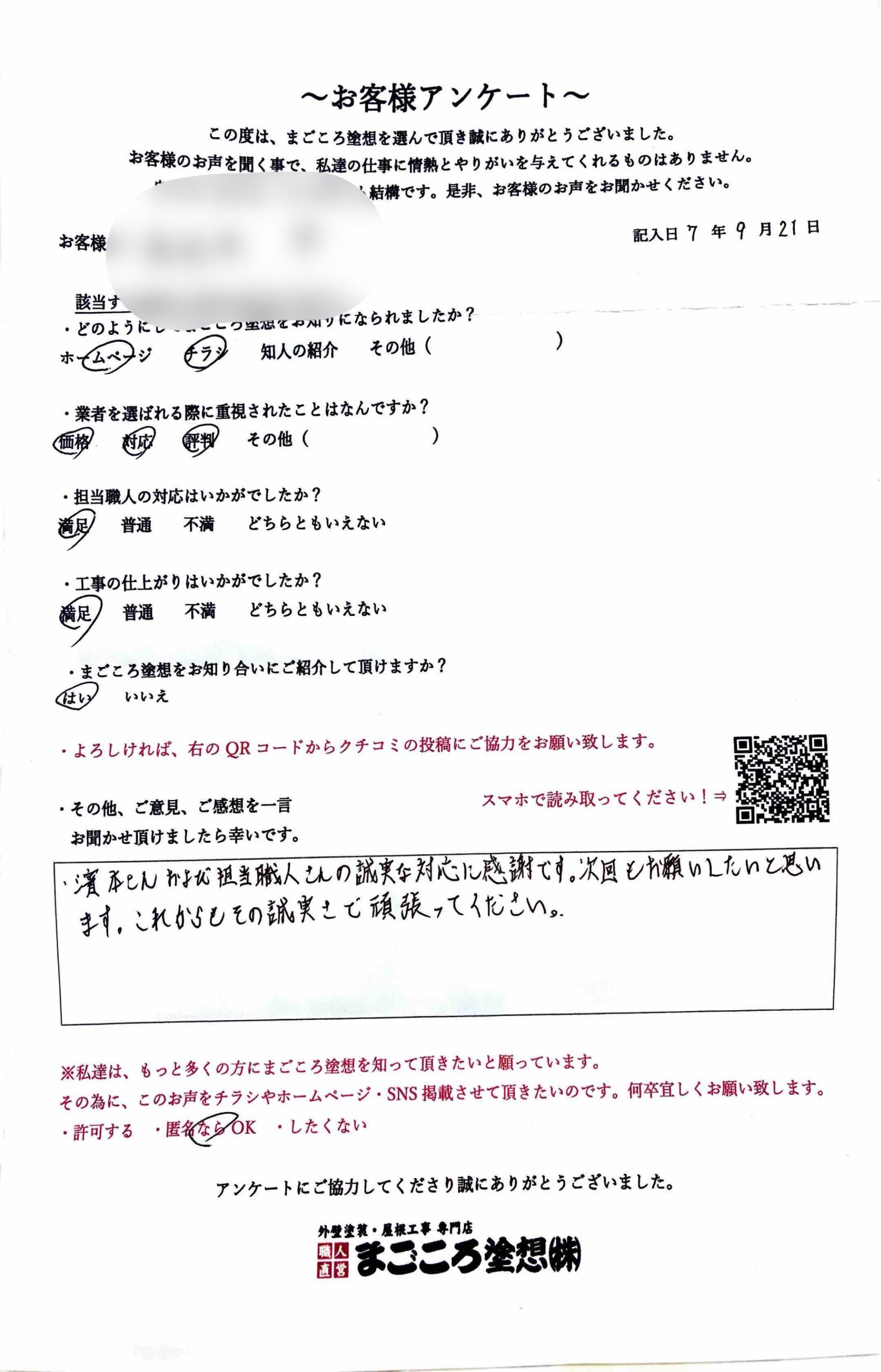 「E様この度は、まごころ塗想をご信頼いただき誠にありがとうございます。二回目の塗替え工事ということもあり前回工事よりも喜んでいただけるお仕事をしよう!と心に決めておりました。温かいお言葉にも感謝しております。まごころ塗想職人一同、【誠実さ】を忘れずお仕事に励みたいと思います。今後とも末永くよろしくお願いいたします。」一級塗装技能士:濱本隼