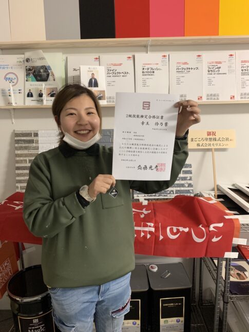 現場親方ブログ2021年12月08日 こんばんは!代表の濱本です! 今日のブログは、題名通り 弊社で活躍しています女子職人れのはちゃんが 二級塗装技能士に合格し 合格証書が届きました!^ – ^ いい笑顔です! まだまだ、この程度で満...