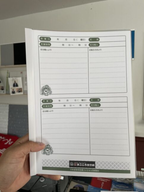 現場親方ブログ2021年11月04日 こんばんは! 代表の濱本です! 本日ご紹介するのは、弊社で工事期間中に取り組んでいる交換日記をご紹介いたします! こちらです! このように毎現場事に日記を作成し ・本日の作業内容 ・翌日の作業内...