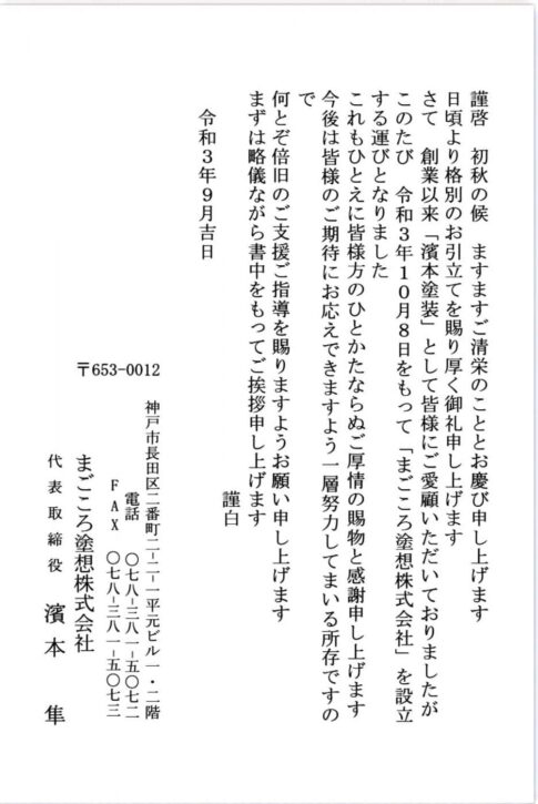 現場親方ブログ2021年09月03日 皆様こんばんは! 代表の濱本です。 濱本塗装は、地域密着塗装店として五年が経過しお陰様で皆様にたくさんのご愛顧いただきました。 創業当初から法人会社にする事も一つの目標に掲げ邁進してきました。 そ...